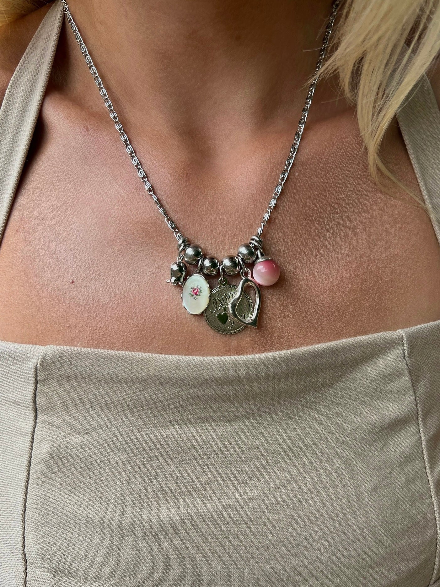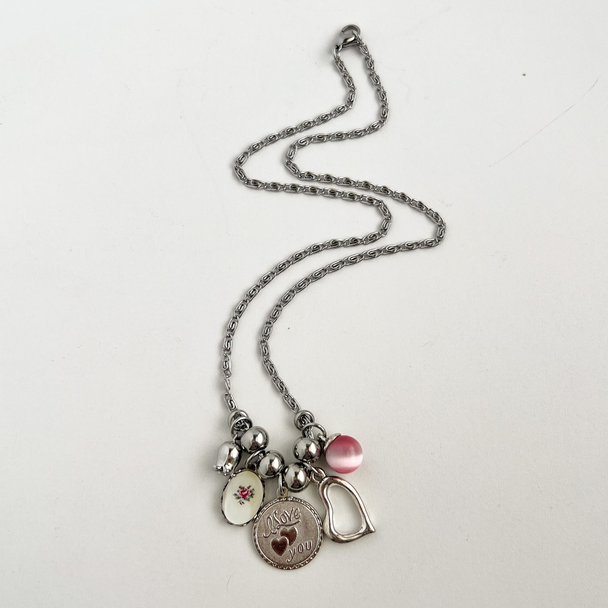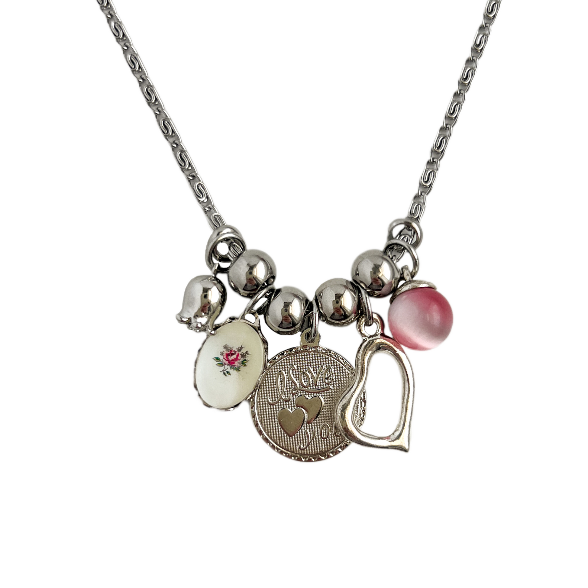 - Vintage Silver-Plated Brass "I Love You" Pendant, Vintage Mother of Pearl Pendant with Rose Decal, Rhodium Plated Brass Tulip, Vintage Pink Cat's Eye Dangle