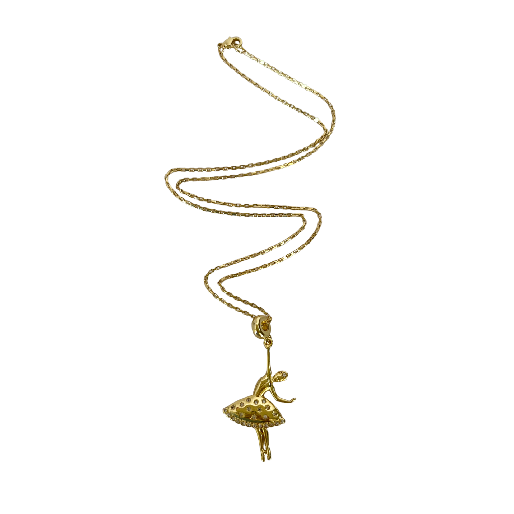 A dancing ballerina with crystal rhinestones dangling from a dainty box chain necklace.