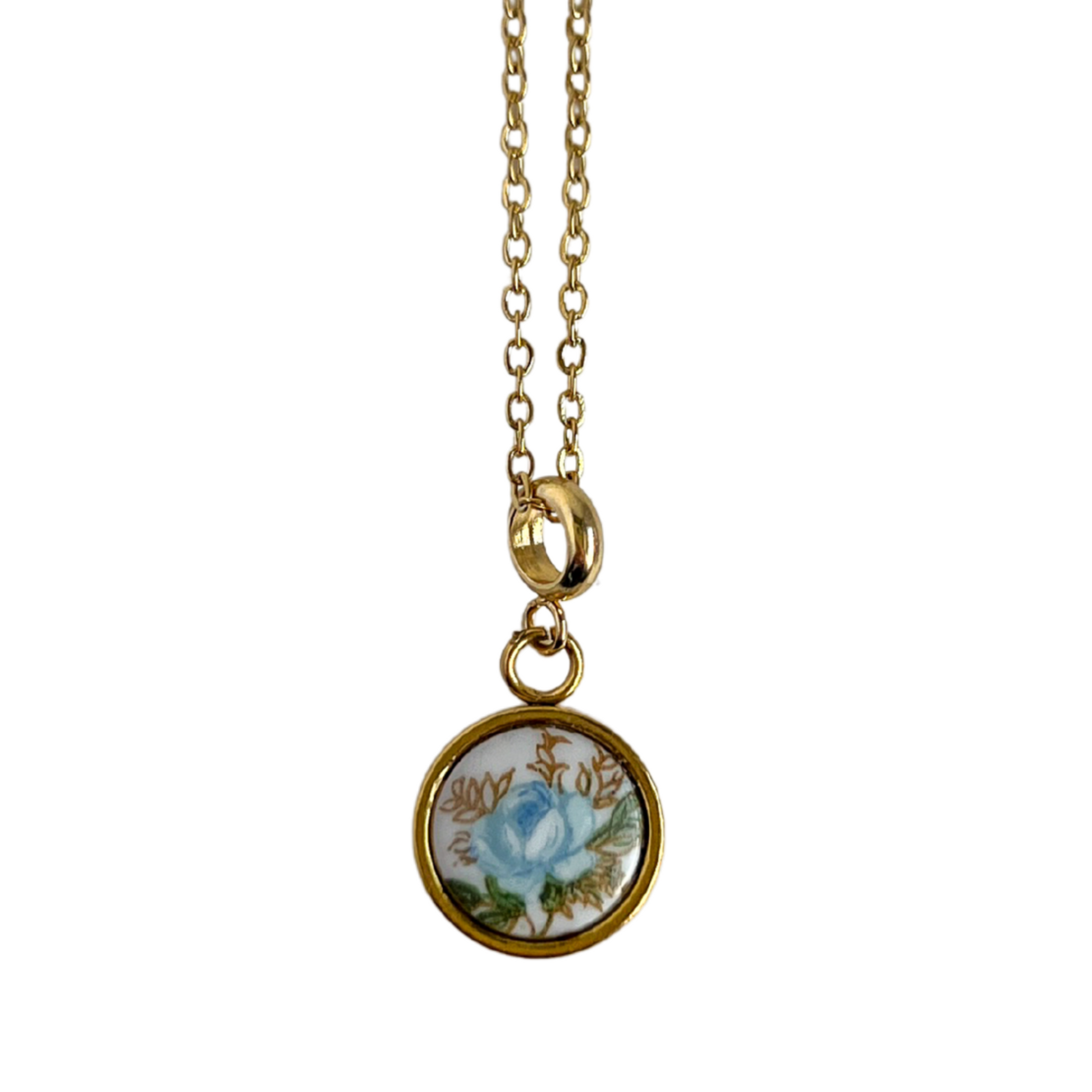 A vintage blue rose stone set in a gold-plated stainless steel bezel.