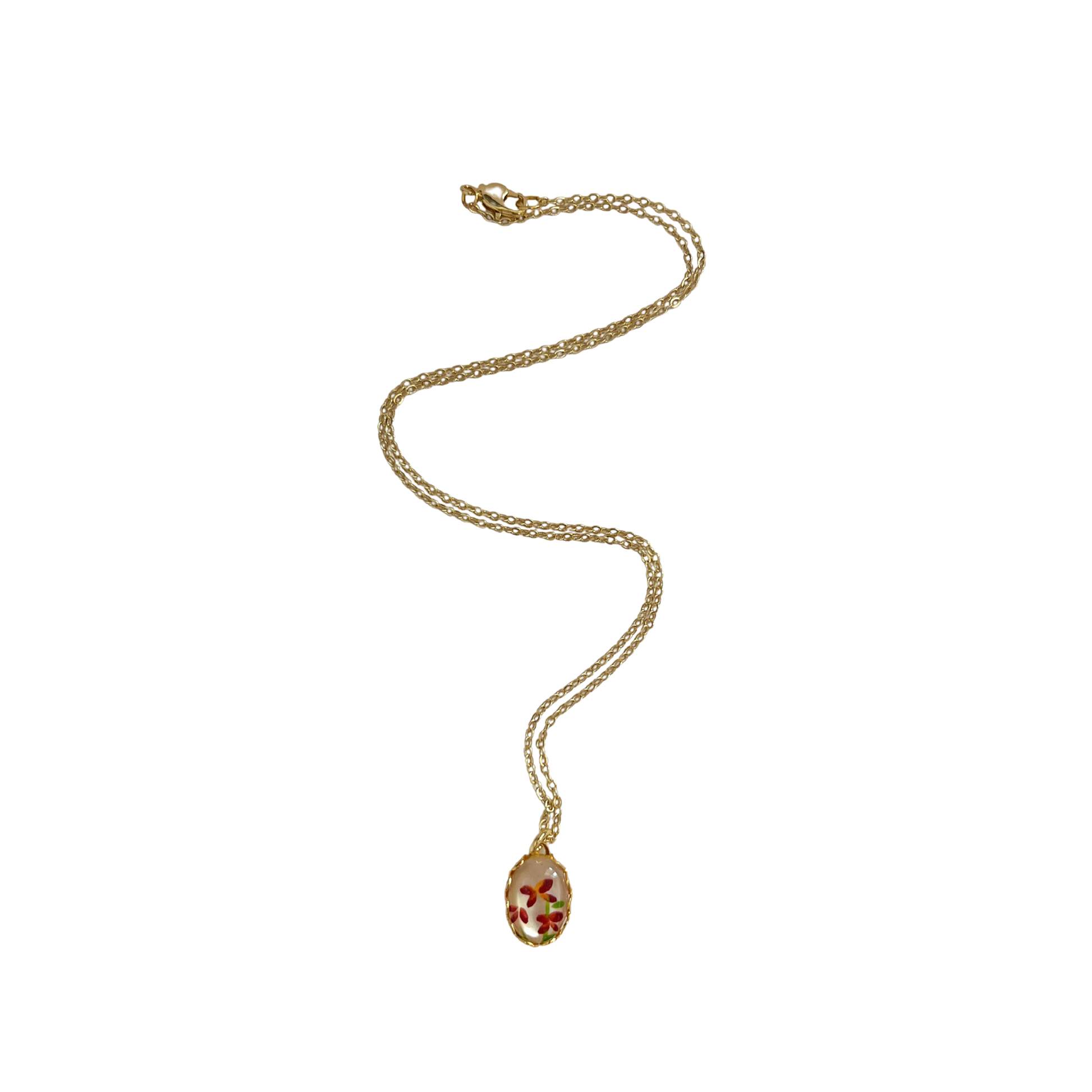 A vintage mother of pearl pendant painted with crimson red & orange flowers set in a gold-plated bezel.