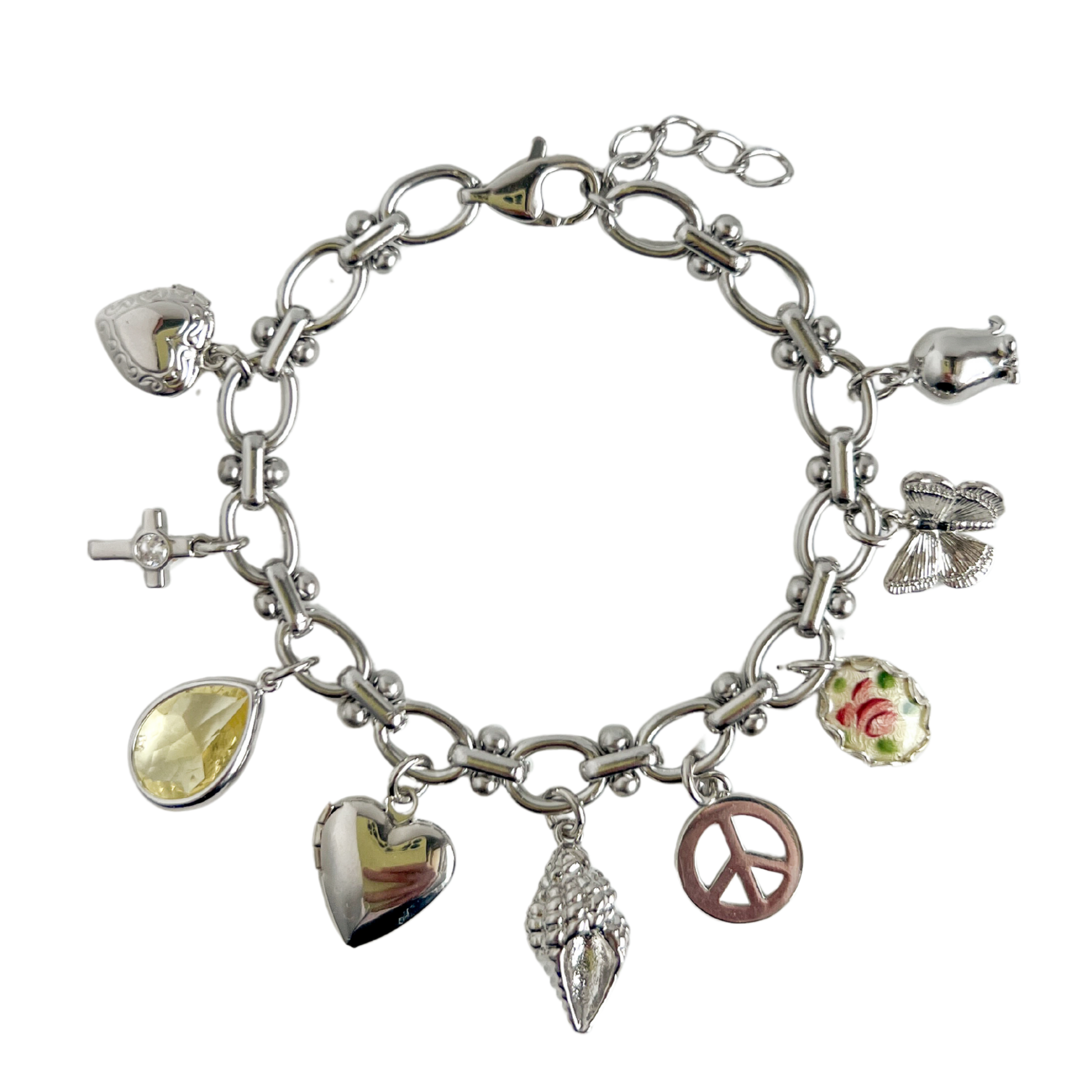 - Vintage Shabby Chic Floral Charm, Silver-Plated Brass Heart Lockets, Cross, Shell, Peace Sign, Butterfly & Flower