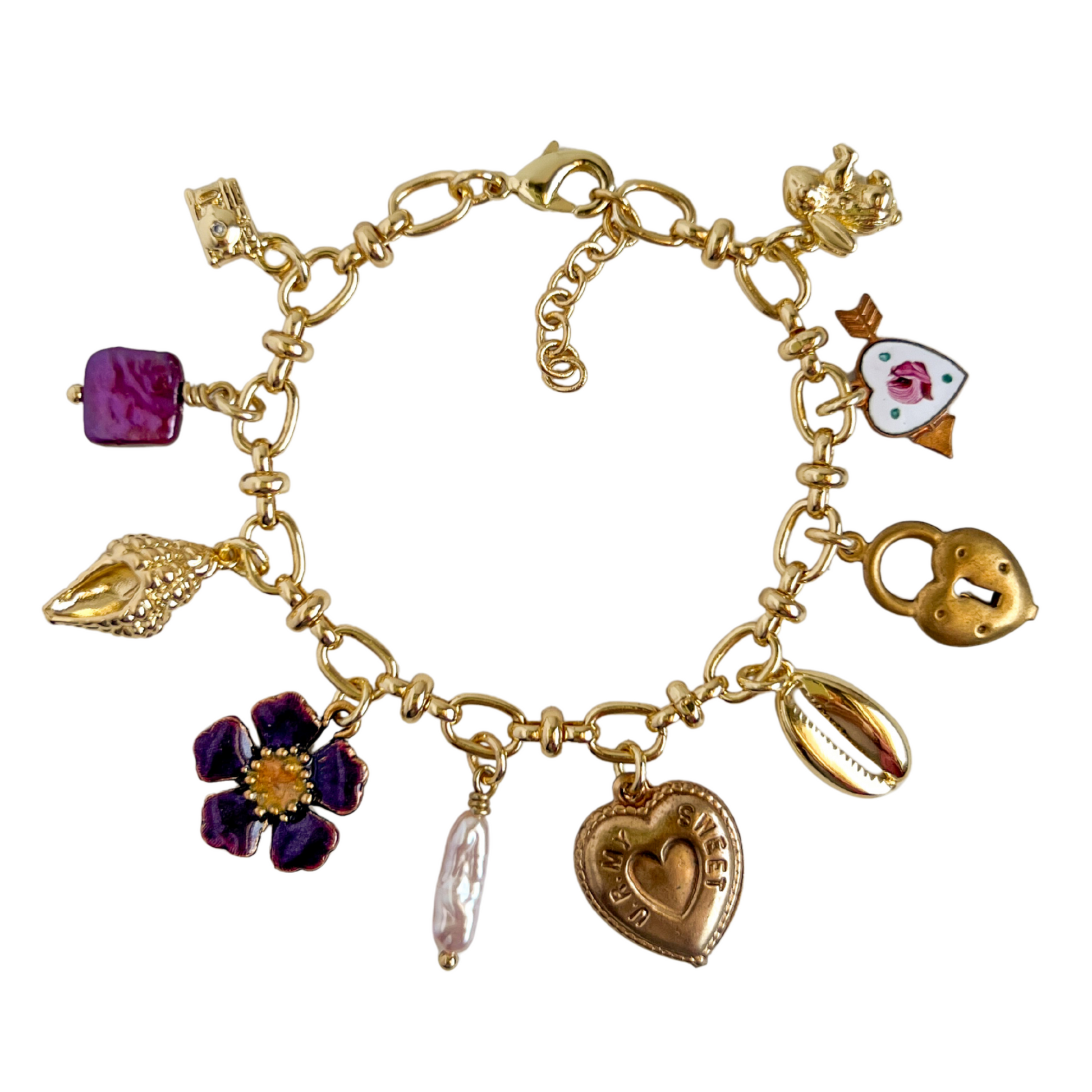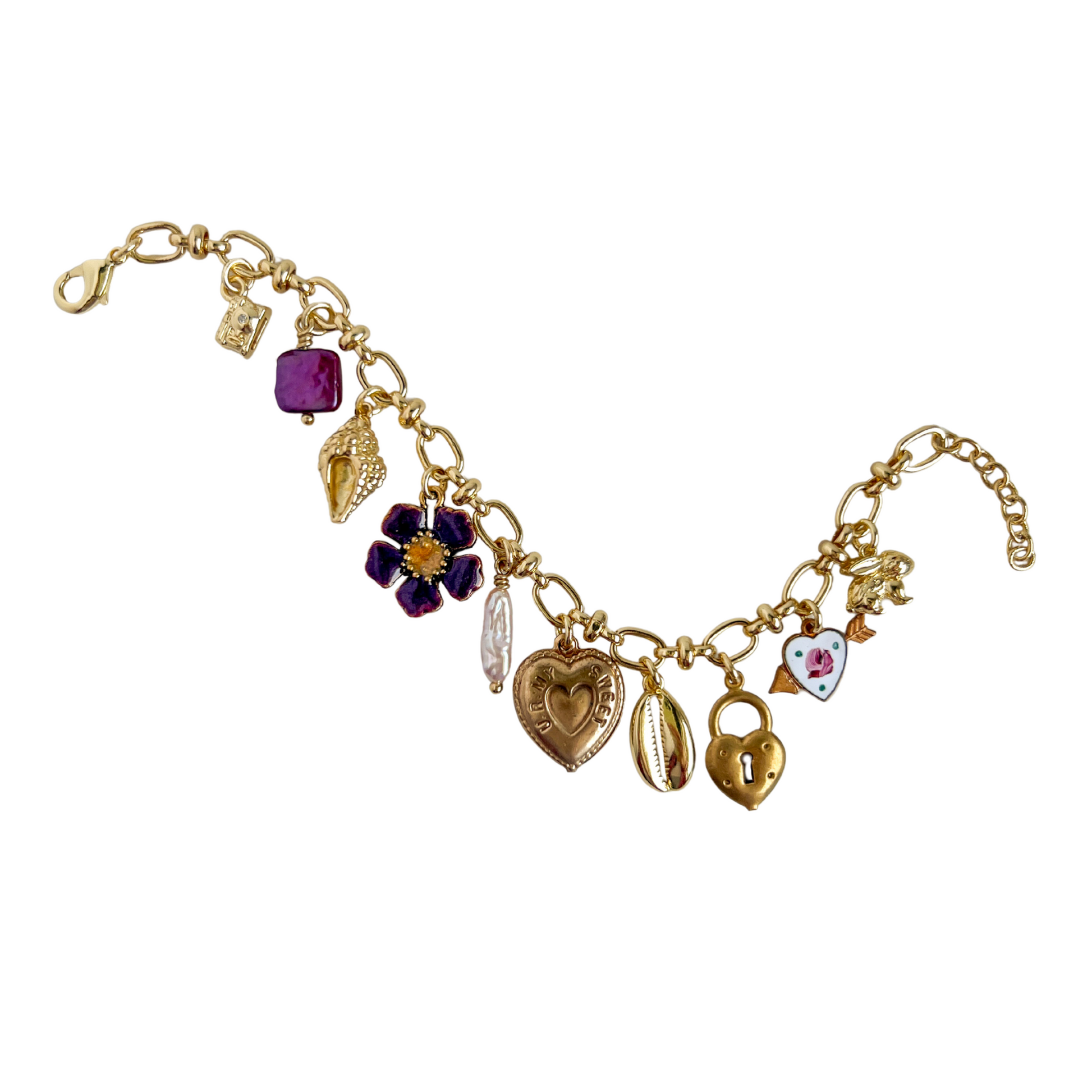 - Assorted 18K Gold-Plated Brass Charms, Vintage Shabby Chic Floral Enamel Heart, Vintage Brass "U R My Sweetheart" Double-Sided Heart, Lilac Biwa Stick Pearl, Maroon Square Pearl