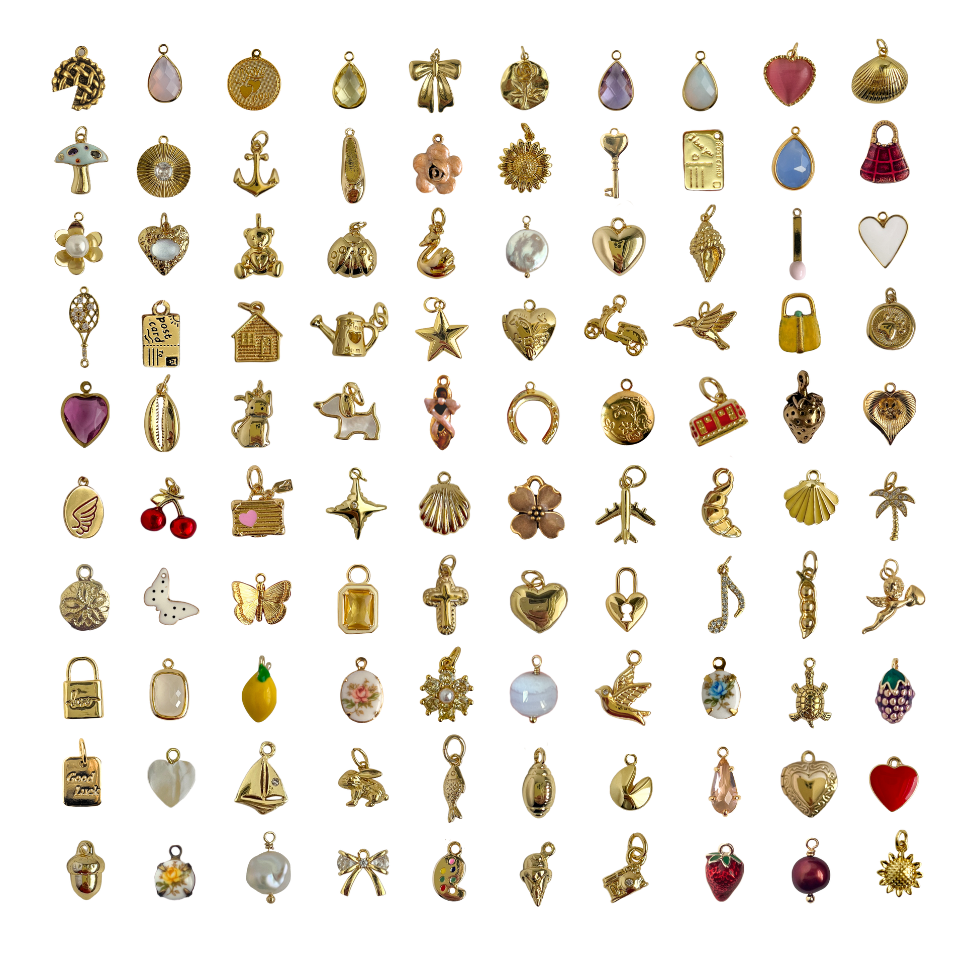 Charms: Mix of vintage and modern charms in gold-plated & vintage brass, gold-filled, enamel, mother of pearl, lead-free pewter, and vintage gemstones