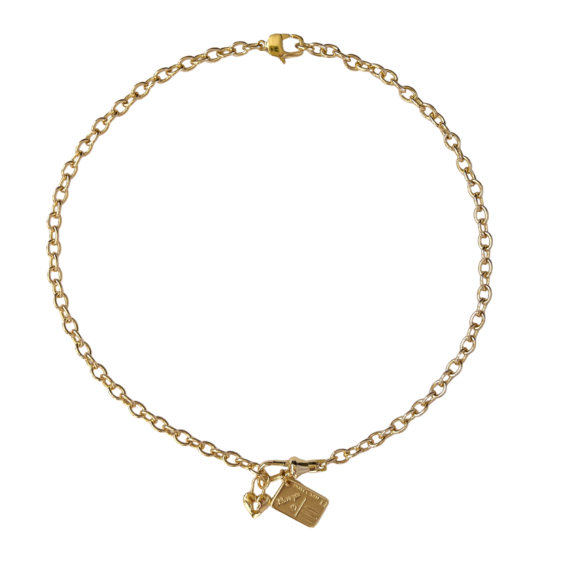An effortless everyday piece featuring an 18K brass postcard and love lock charm on a delicate 18K brass gold-plated chain. Timeless, romantic, and perfect for layering.
