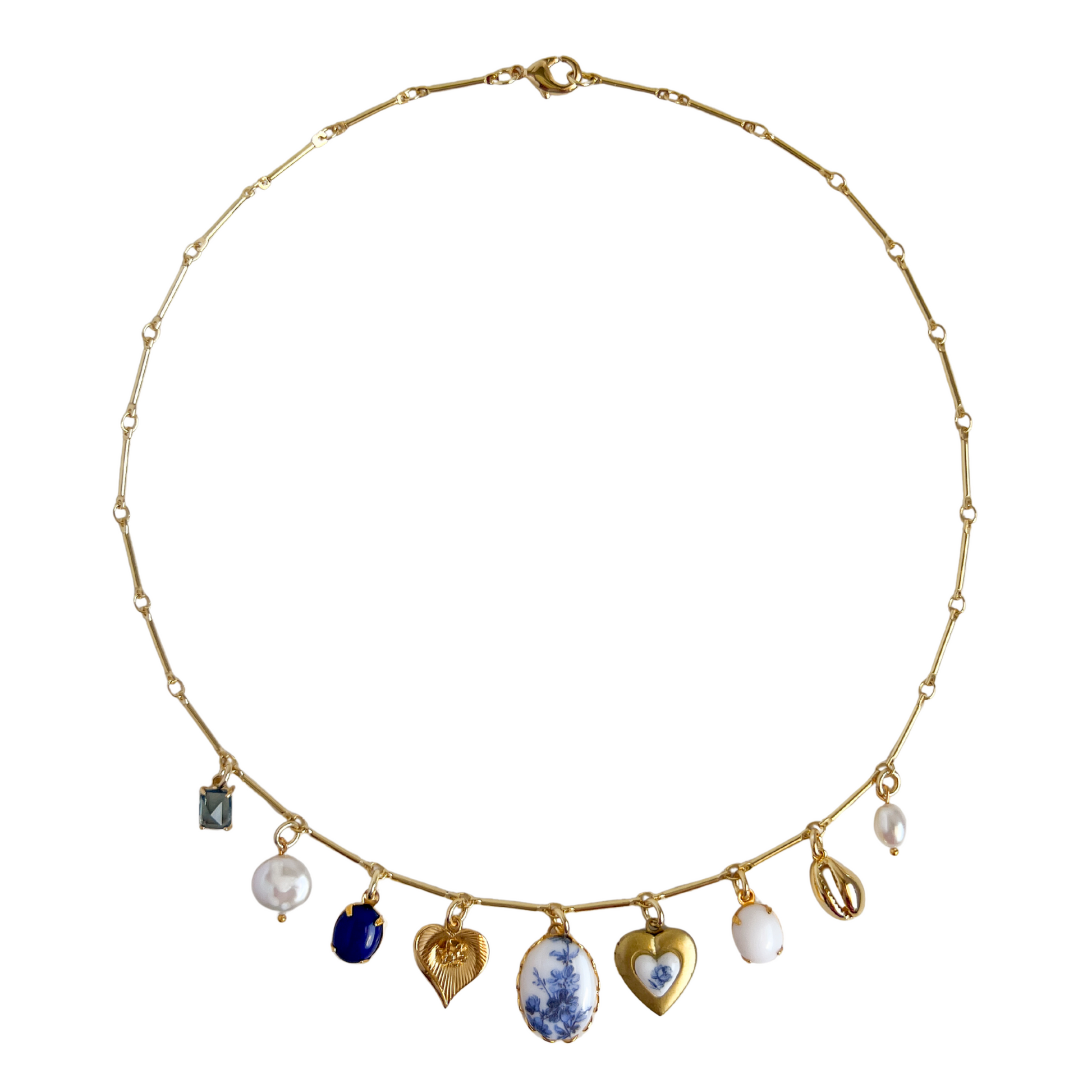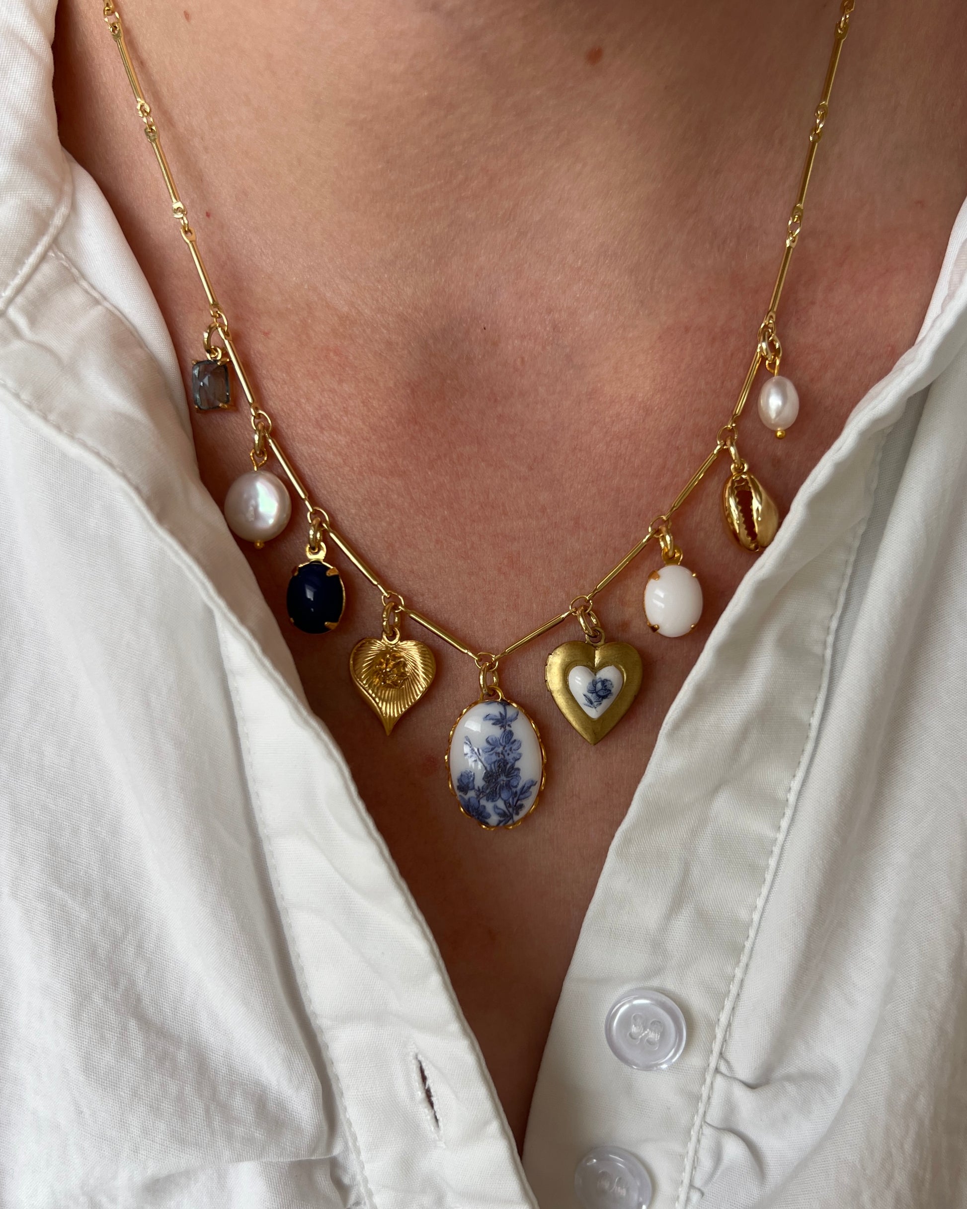A vintage-inspired piece featuring a 1980s blue floral glass pendant accented with natural white pearls, vintage stones, and a delicate brass heart locket. Suspended from an 18K gold-plated dainty chain for an elegant, timeless finish.