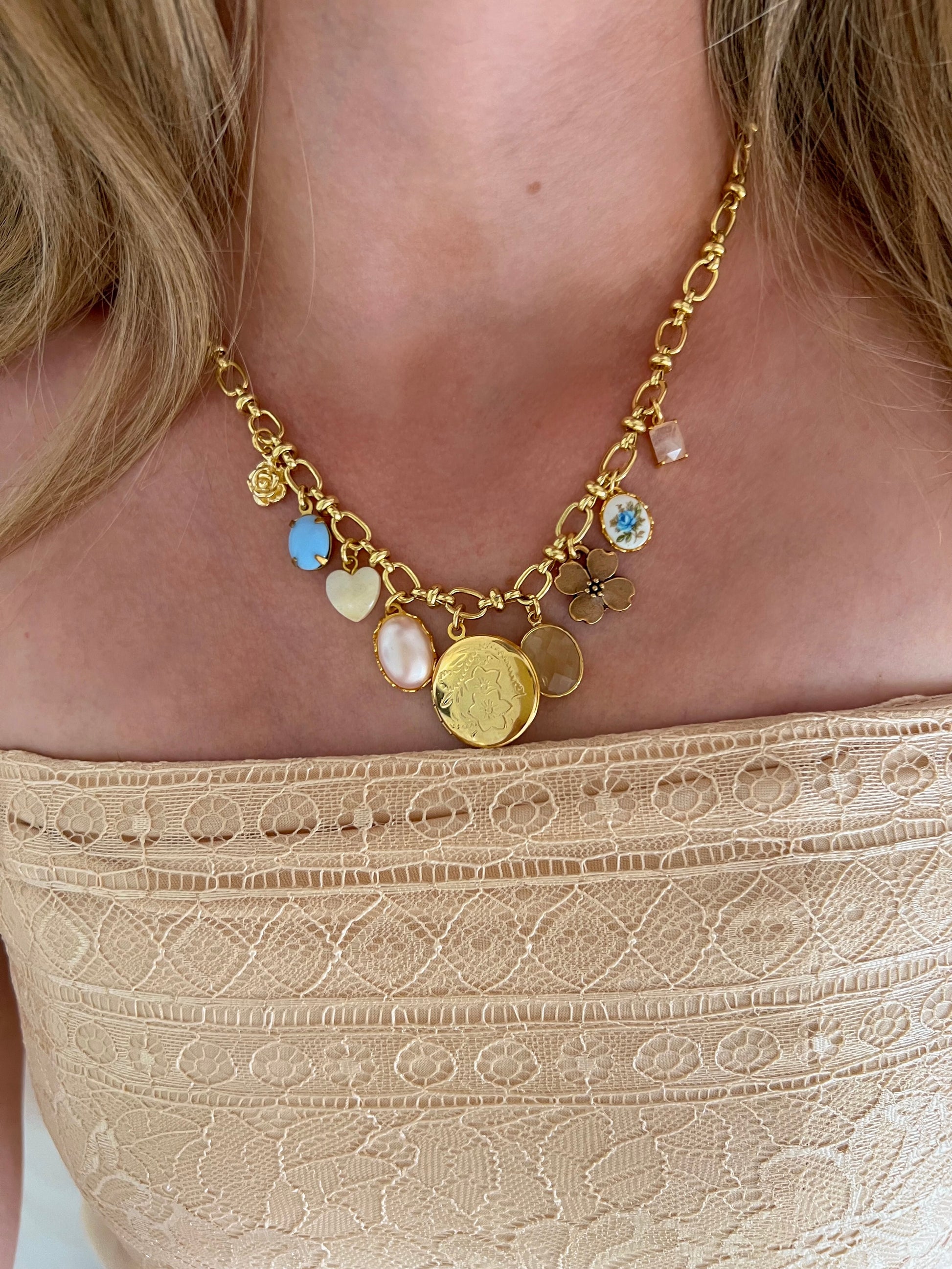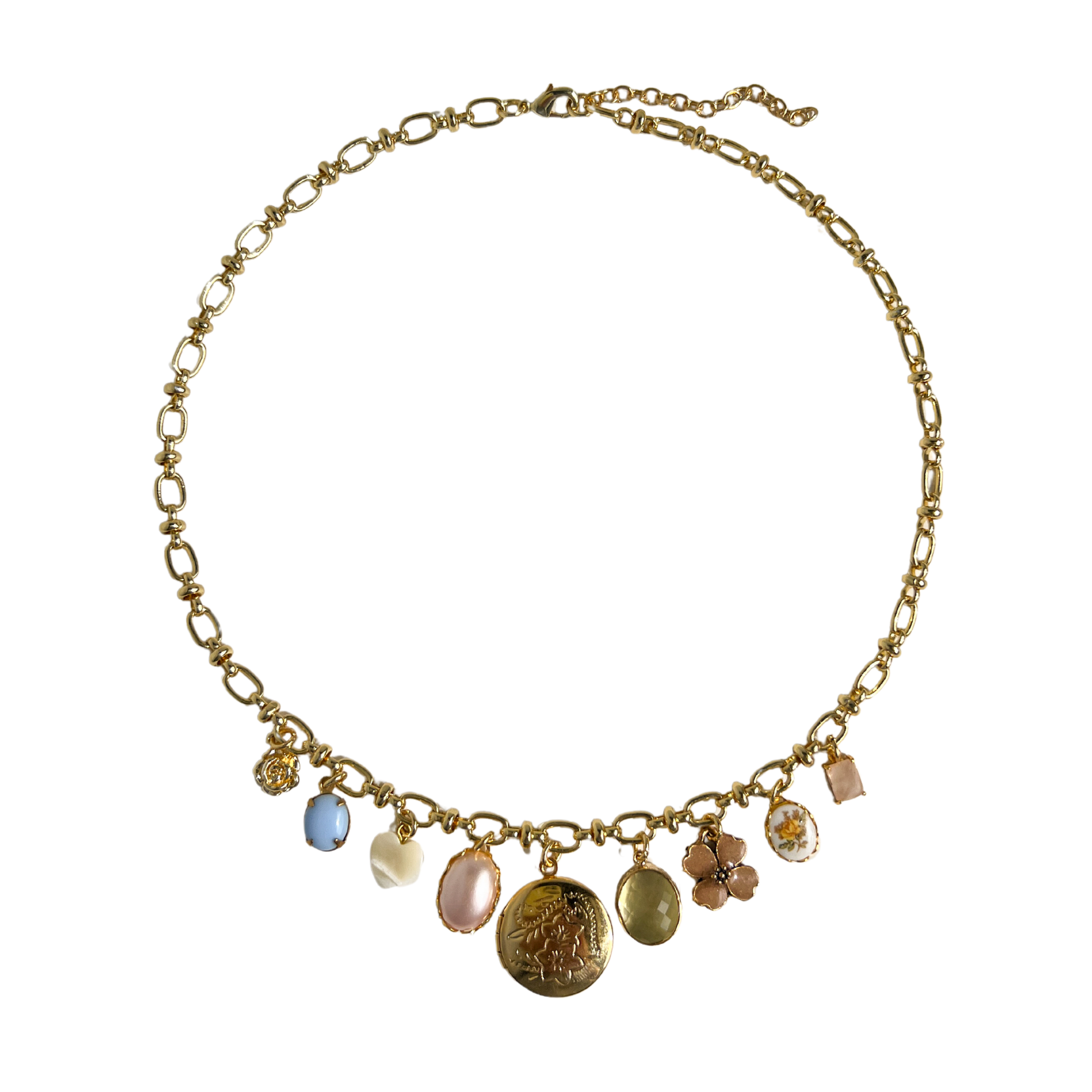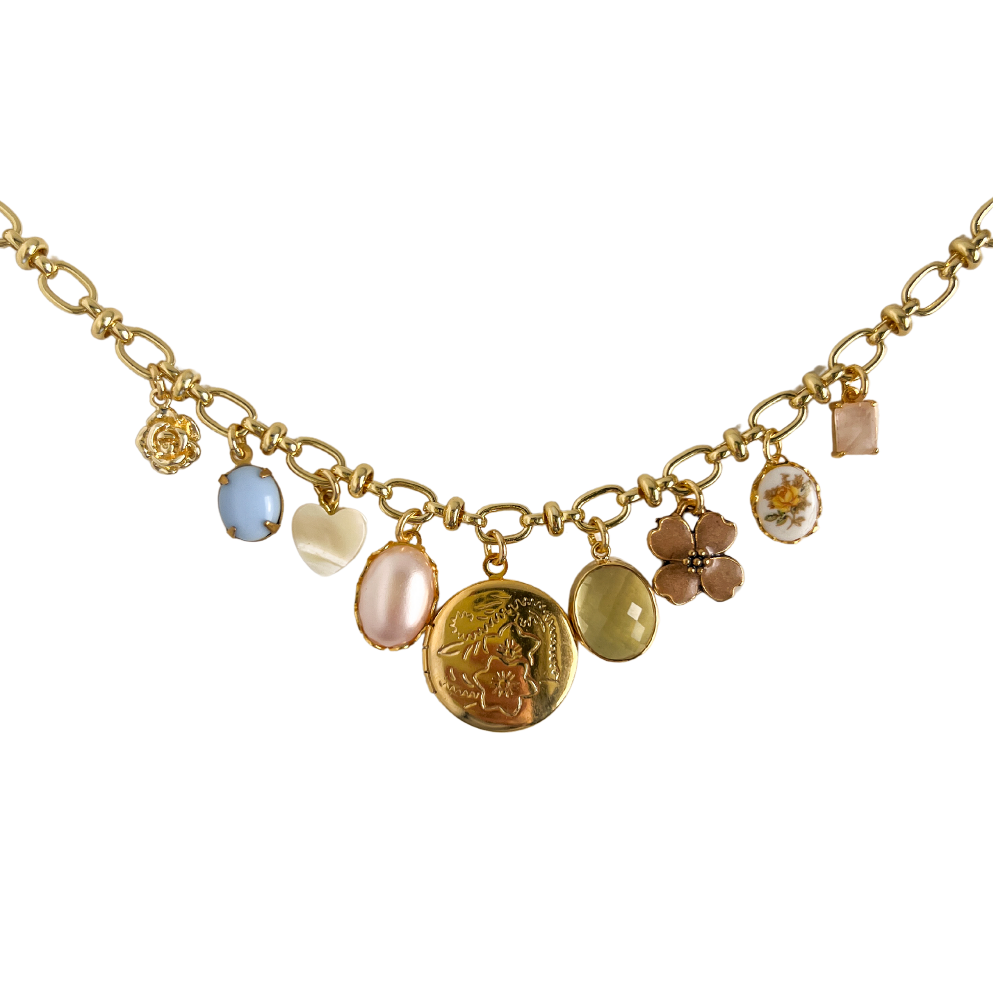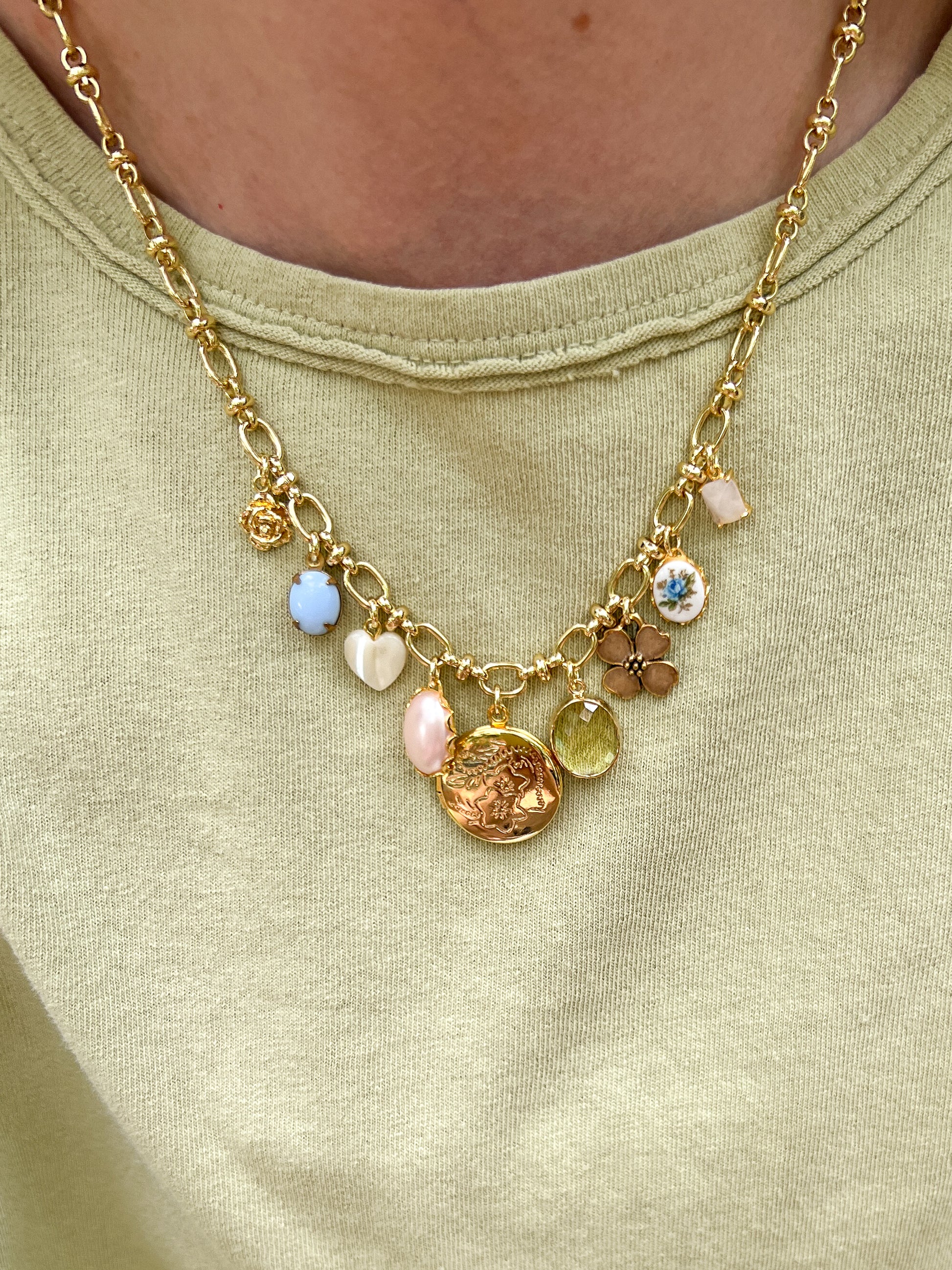 - Vintage Gold-Plated Brass Floral Etched Locket, Vintage Mother of Pearl Heart, 18K Gold-Plated Brass Rose & Yellow Glass Stone, Vintage Pearlescent Pink Stone, Vintage Baby Blue Stone