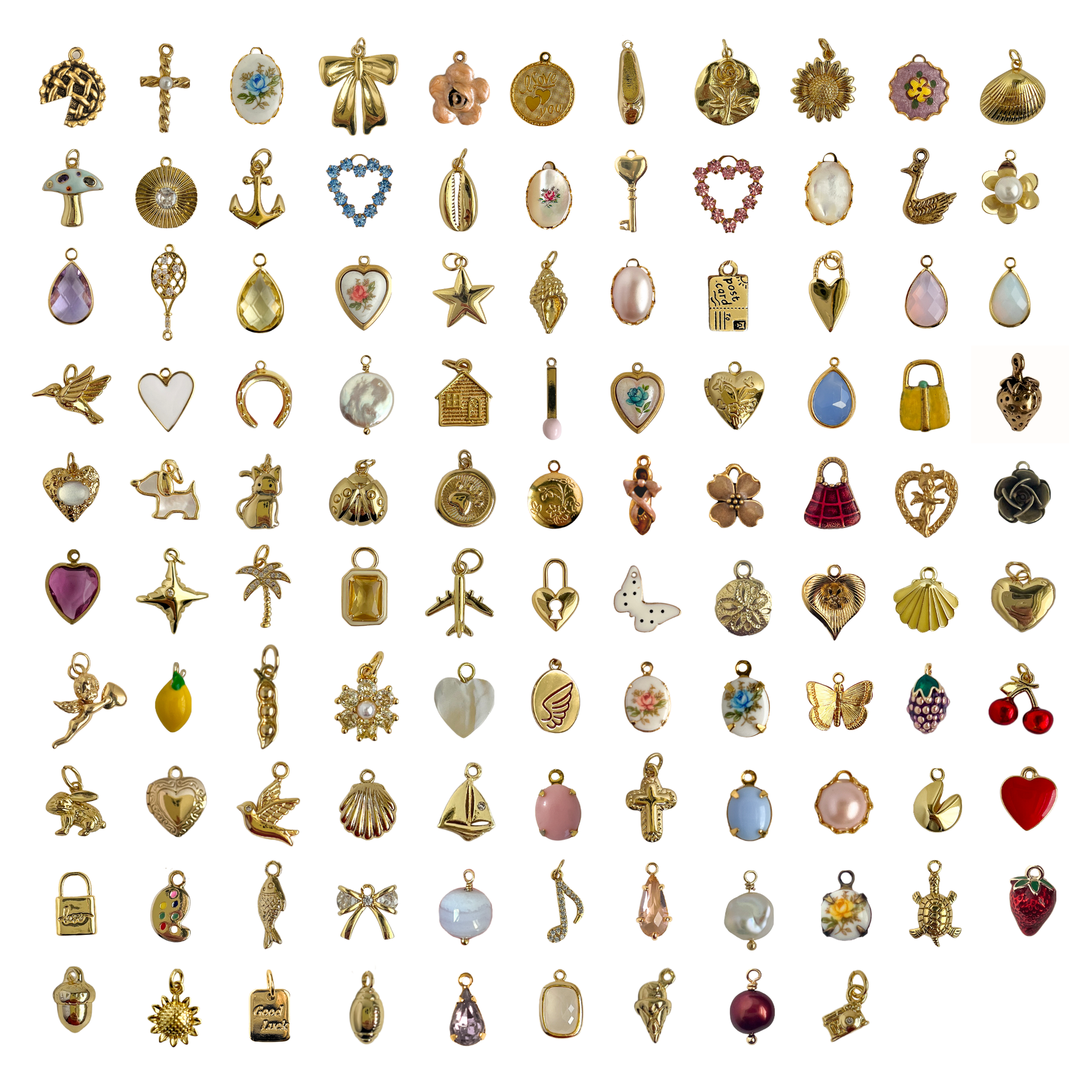 Charm Materials: A curated mix of gold-plated and vintage brass, gold filled, genuine freshwater & mother of pearls, vintage gemstones, enamel, glass + more