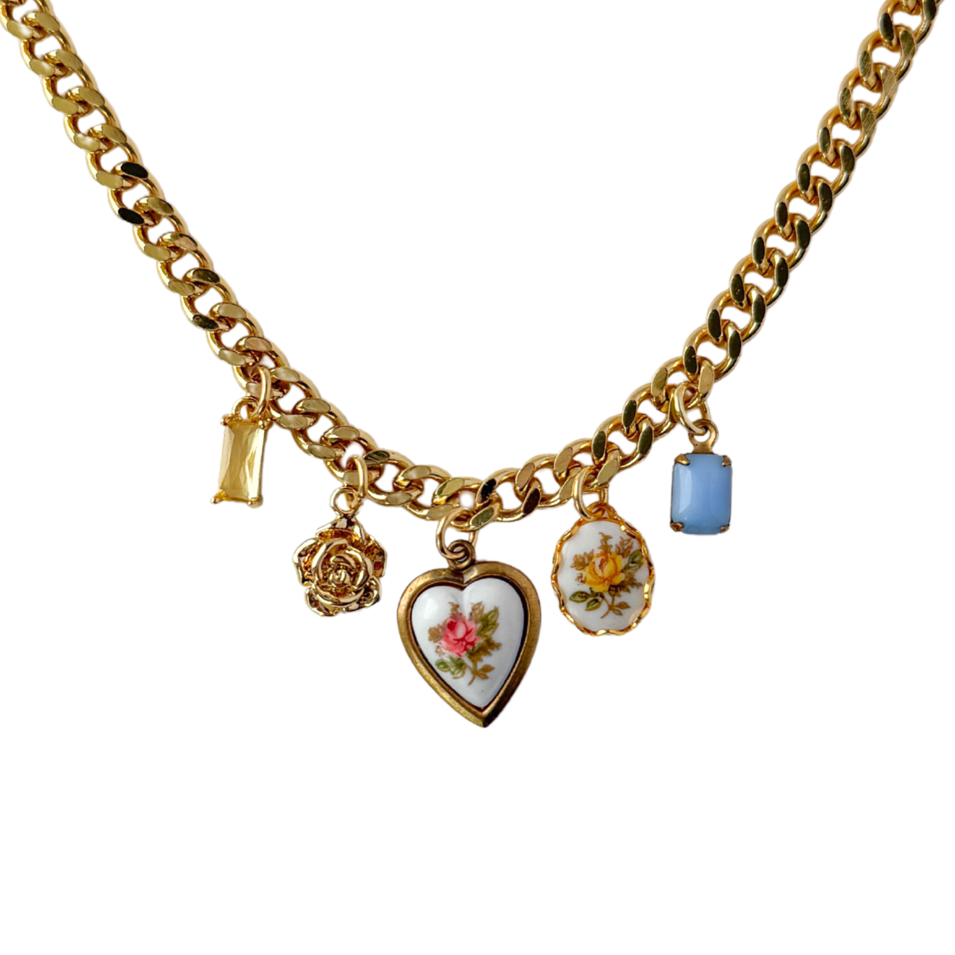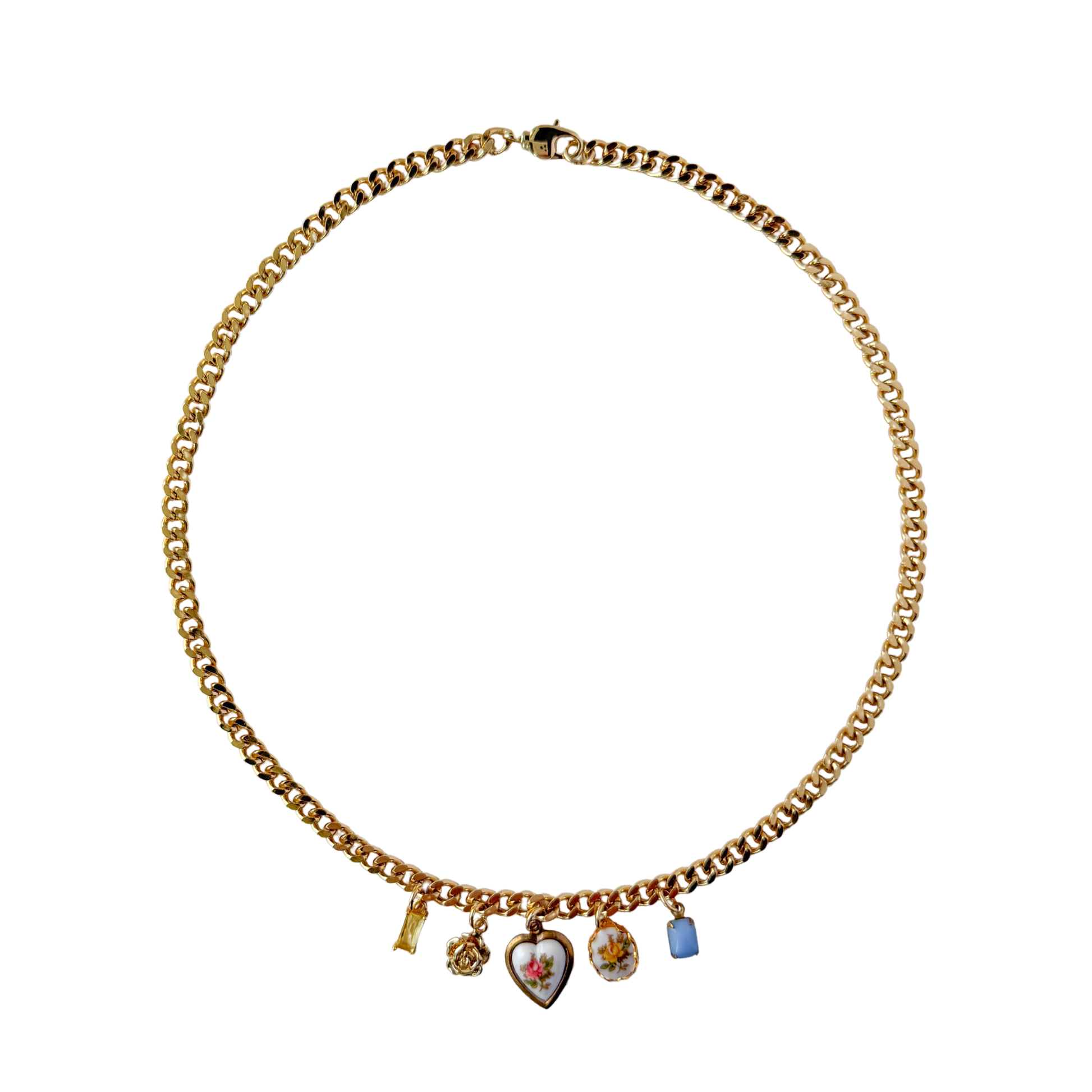 Vintage springtime floral charms dangling along an 18K brass chain.