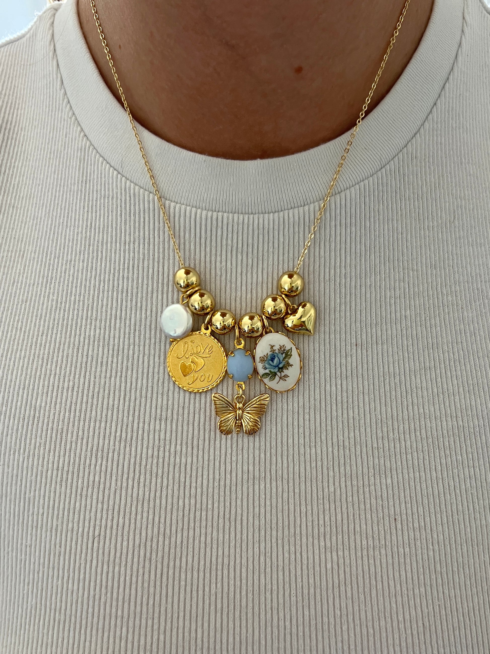 A romantic mix of treasures: an “I Love You” coin pendant, white genuine coin pearl, delicate 18k brass butterfly and heart charms, a pastel blue vintage rose, and a baby-blue vintage stone, all strung on a dainty 18k brass chain.