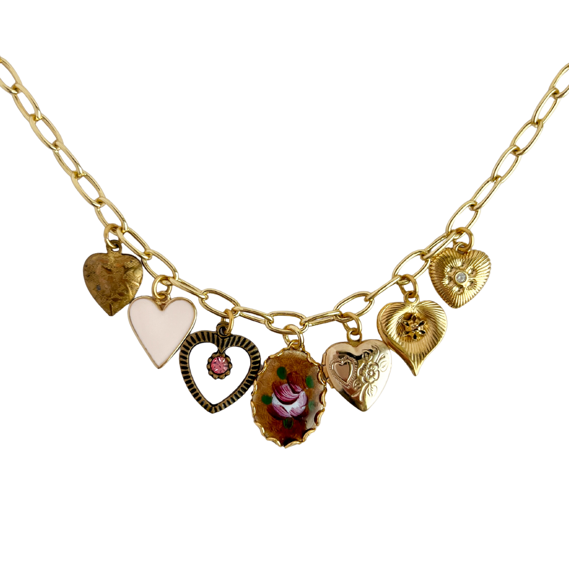 A vintage-inspired collection of heart charms, featuring a vintage enamel floral pendant along with a mix of vintage and 18K brass hearts and lockets.